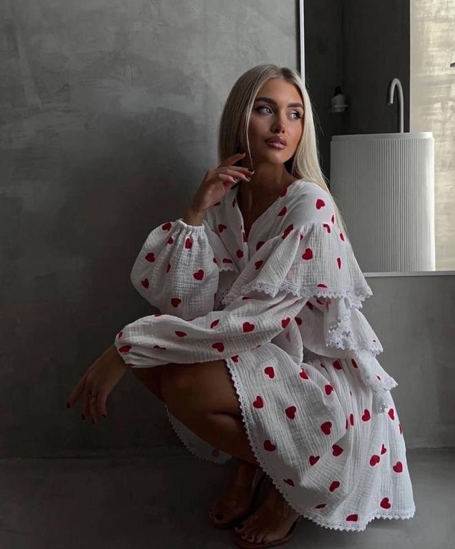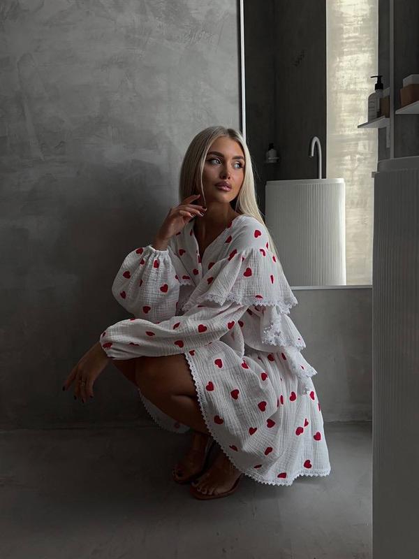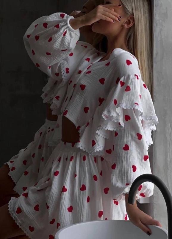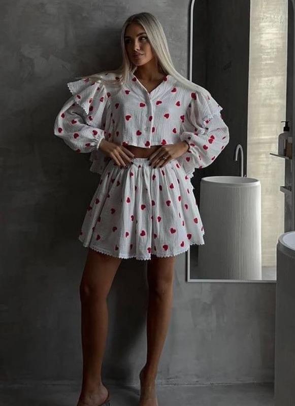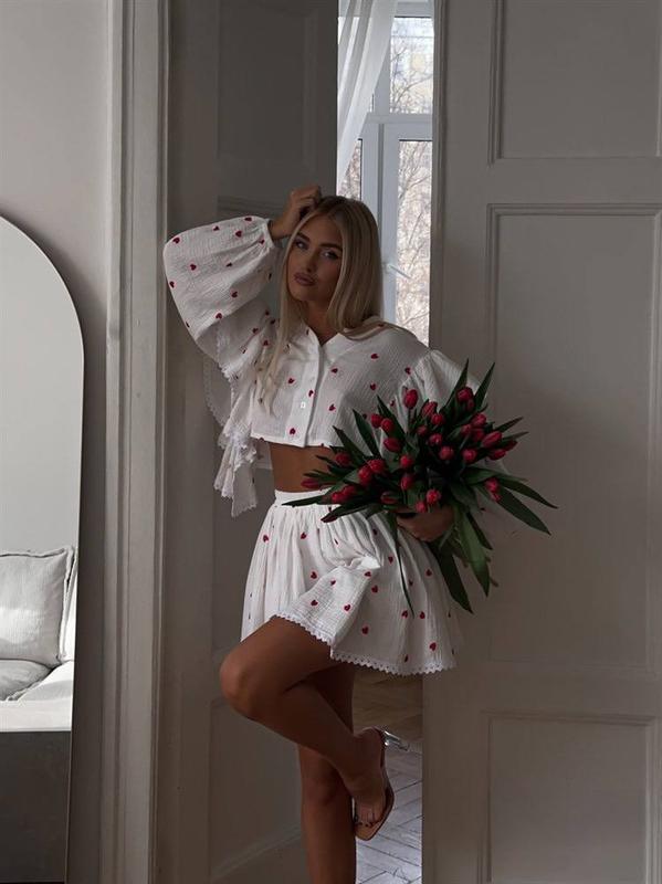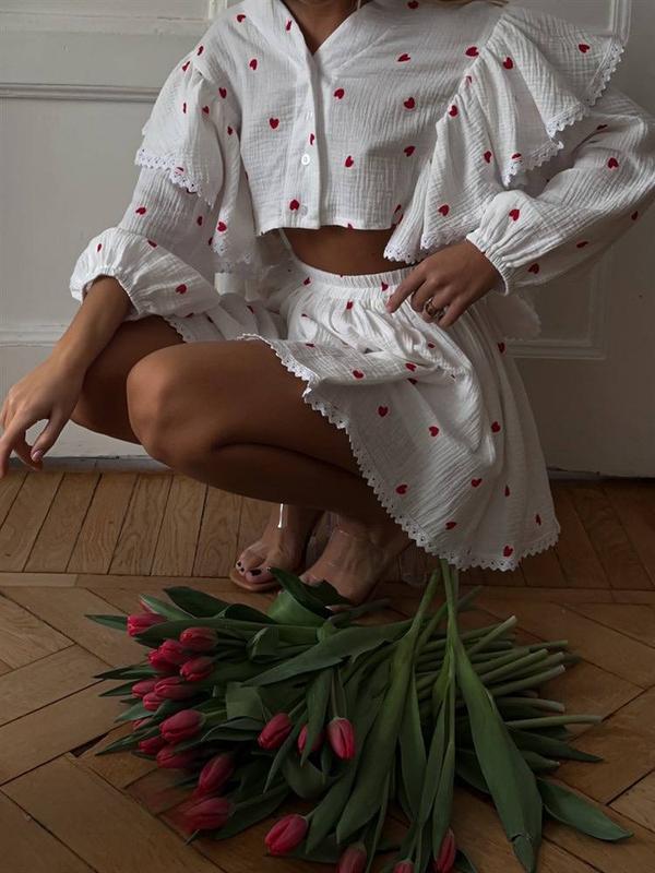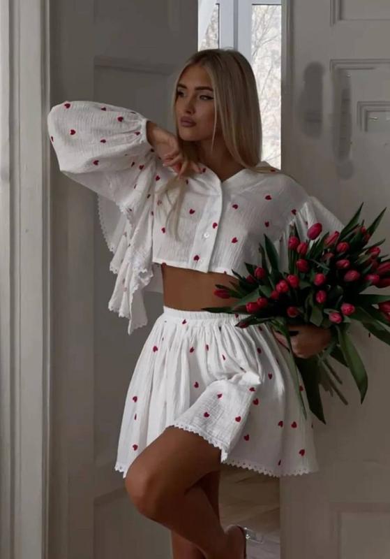 Костюм женский из натуральной ткани муслина муслиновый в сердечки белый юбка и рубашка...