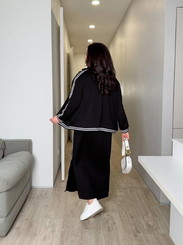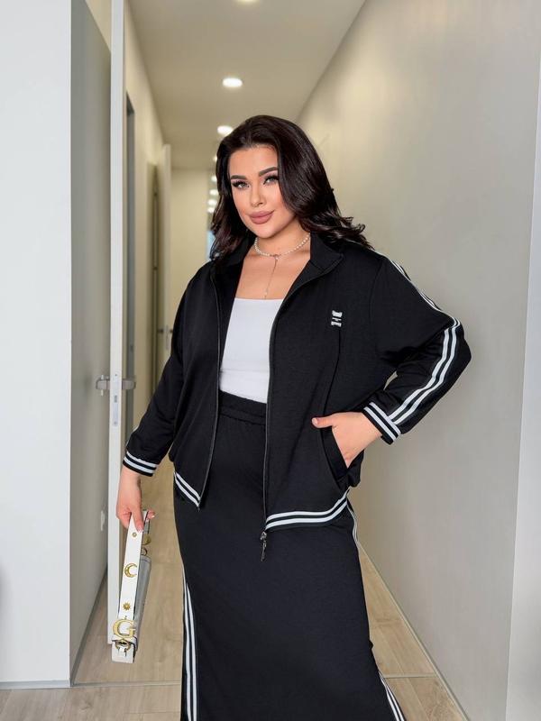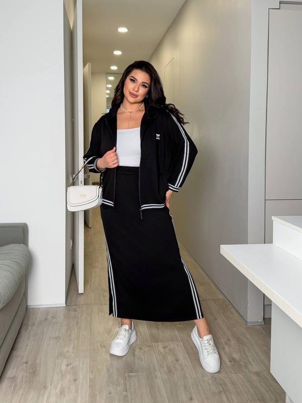 Стильный костюм кофта с юбкой. Юбка длинная, с разрезами по бокам, с лампасами. Талия на резинке. Кофта на молнии, с карманами, рукав 3/4, манжеты на резинке. Низ кофты на резинке.