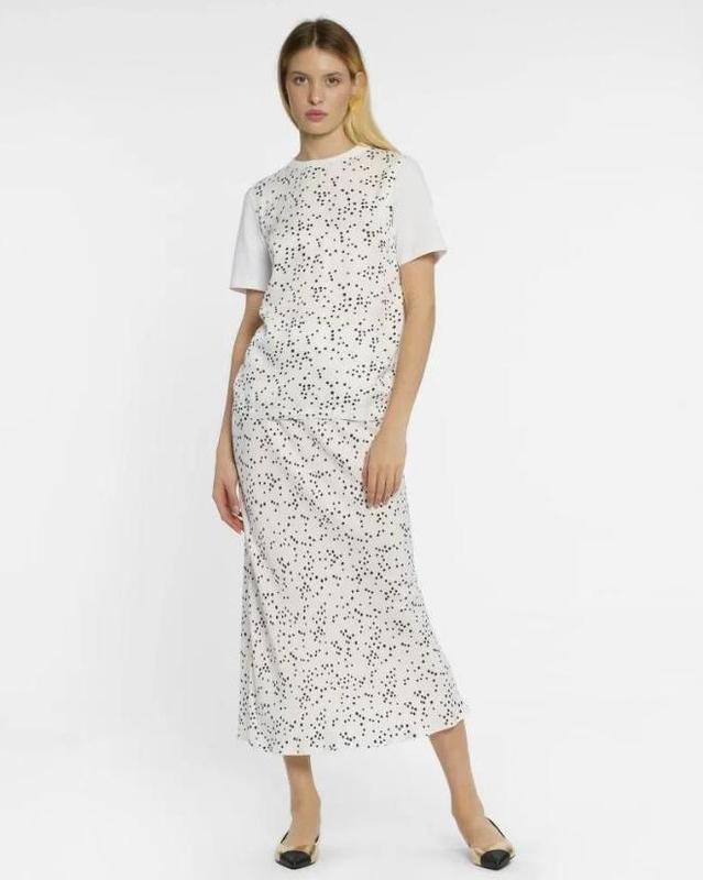 указан 52 наш размер футболка длина 53 пог 58 юбка длина 95 поб до 65 пот до 50 Топ Arber. Модель прямого силуету з коротким рукавом спереду модель виготовлена з м'якої віскози з сатиновою текстурою білого кольору в чорний принт, ззаду з тонкого бавовняного джерсі з додаванням еластану білого кольору. Спідниця міді Arber, білого кольору в чорний принт. Виготовлена з м'якої віскози. Виріб має сатинову текстуру та крій по косій, пояс на гумці. Ідеально підходить як для повсякденних образів, так святкових.
