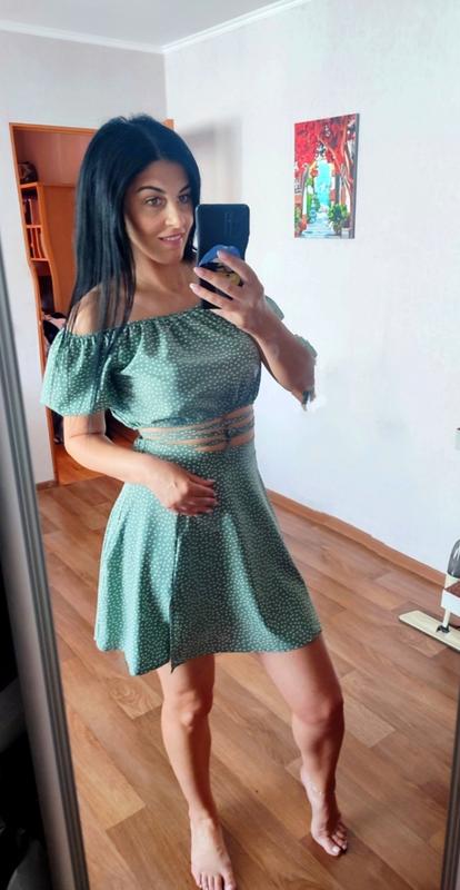 очень красивый костюм, на размер М, топ на грудь до 105, низ на резиночке, плечики можно спускать, юбочка талия на резинке, длина 50см