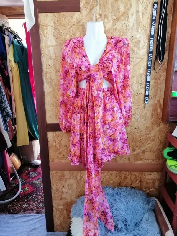 летний шифоновый костюм юбка из двойной ткани и блуза с длинной завязкой которую можно обернуть вокруг талии пышный объемный рукав цветочный Принт размеры от сорок восьмого до 56