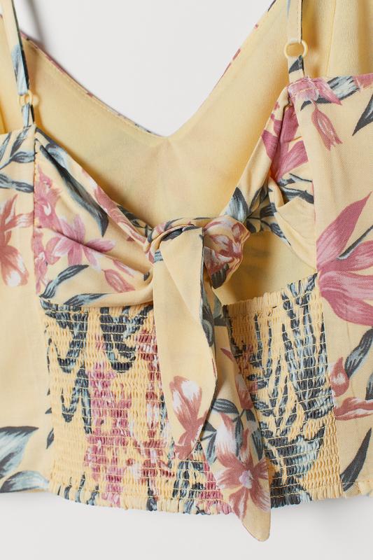 Короткий топ с V-образным вырезом, резинкой и завязками на спине, а также узкими регулируемыми бретелями. Подкладка спереди.