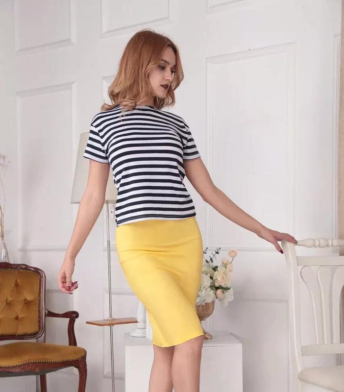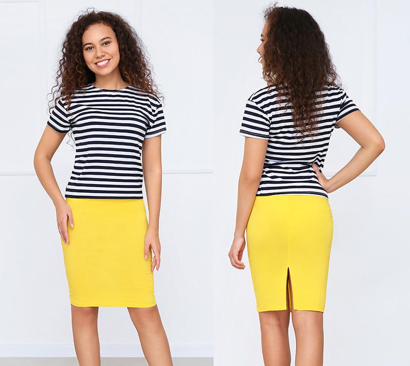 Наряд состоит из двух единиц: юбочка и блуза-футболка. Летняя блузочка имеет полосатую расцветку, полуприталенный пошив, вырез горловины круглой формы и короткий рукав. Юбка “карандаш” – классика всех времен с модной длиной миди. Завышенная посадка изделия подчеркивает утонченные формы фигуры и сексуально подчеркивает линию бедер. Застегивается на потайную молнию сзади.